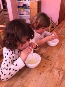 - Sembrar el jardín para la liebrecita. Lo hacemos entre maestras y niños, fomentando así el trabajo en equipo. Llenamos los cuencos tierra y semillas, y los vamos regando y cuidando hasta que crecen bellos y frondosos. Durante tres semanas, los niños viven un proceso de crecimiento real, todos los días llegan al colegio impacientes por ver cómo está la hierba de su platito. ¡Esto sí que es una buena estimulación sensorial!